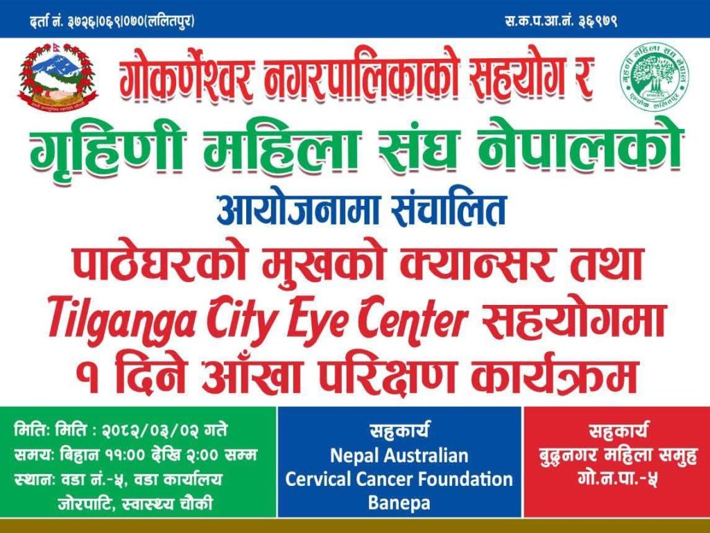 Housewife association Nepal organized cervical cancer health post Under the assistance of Gokarneshwor municipality whereas coordination from NACCF-NNCTR Nepal and Tilganga city eye center